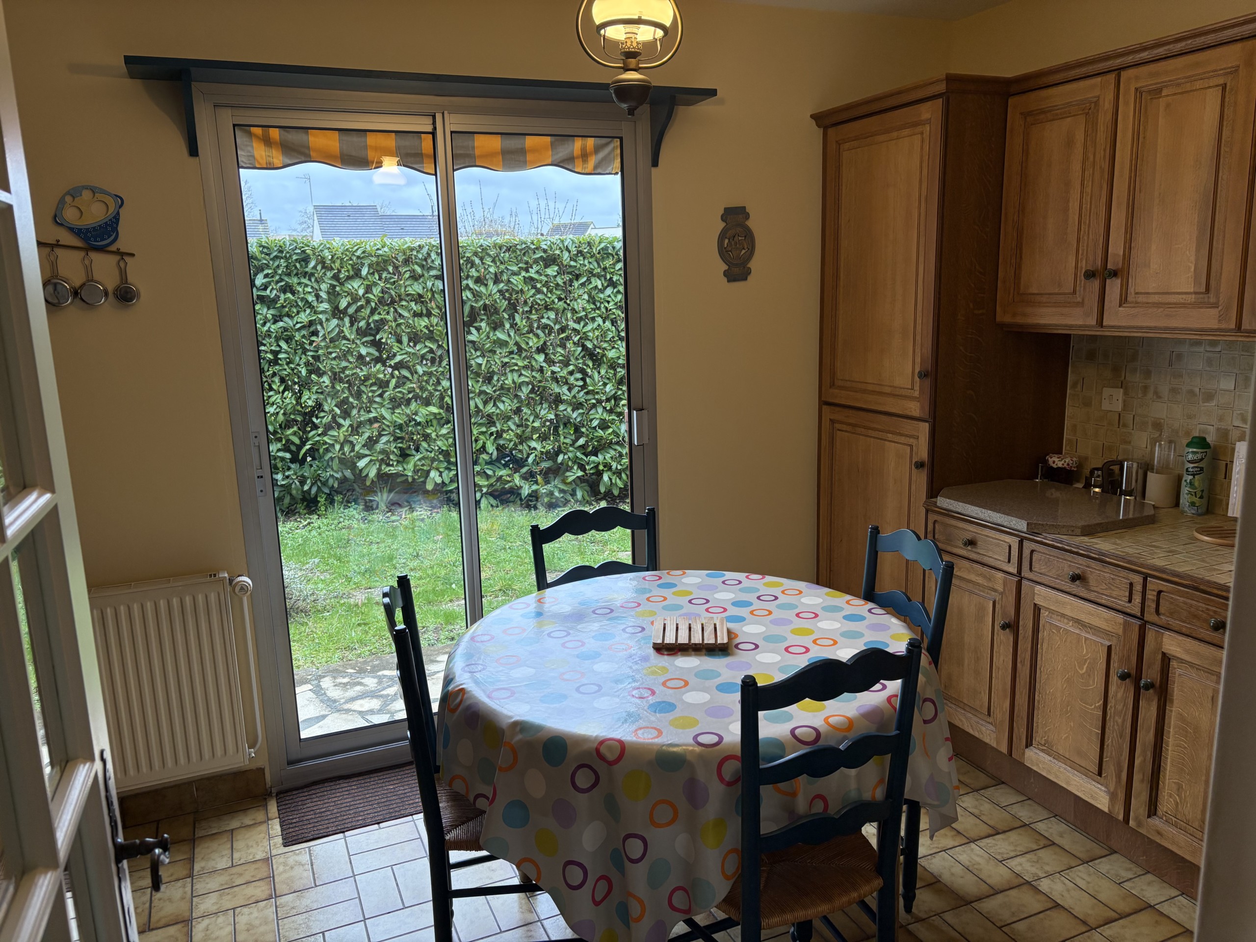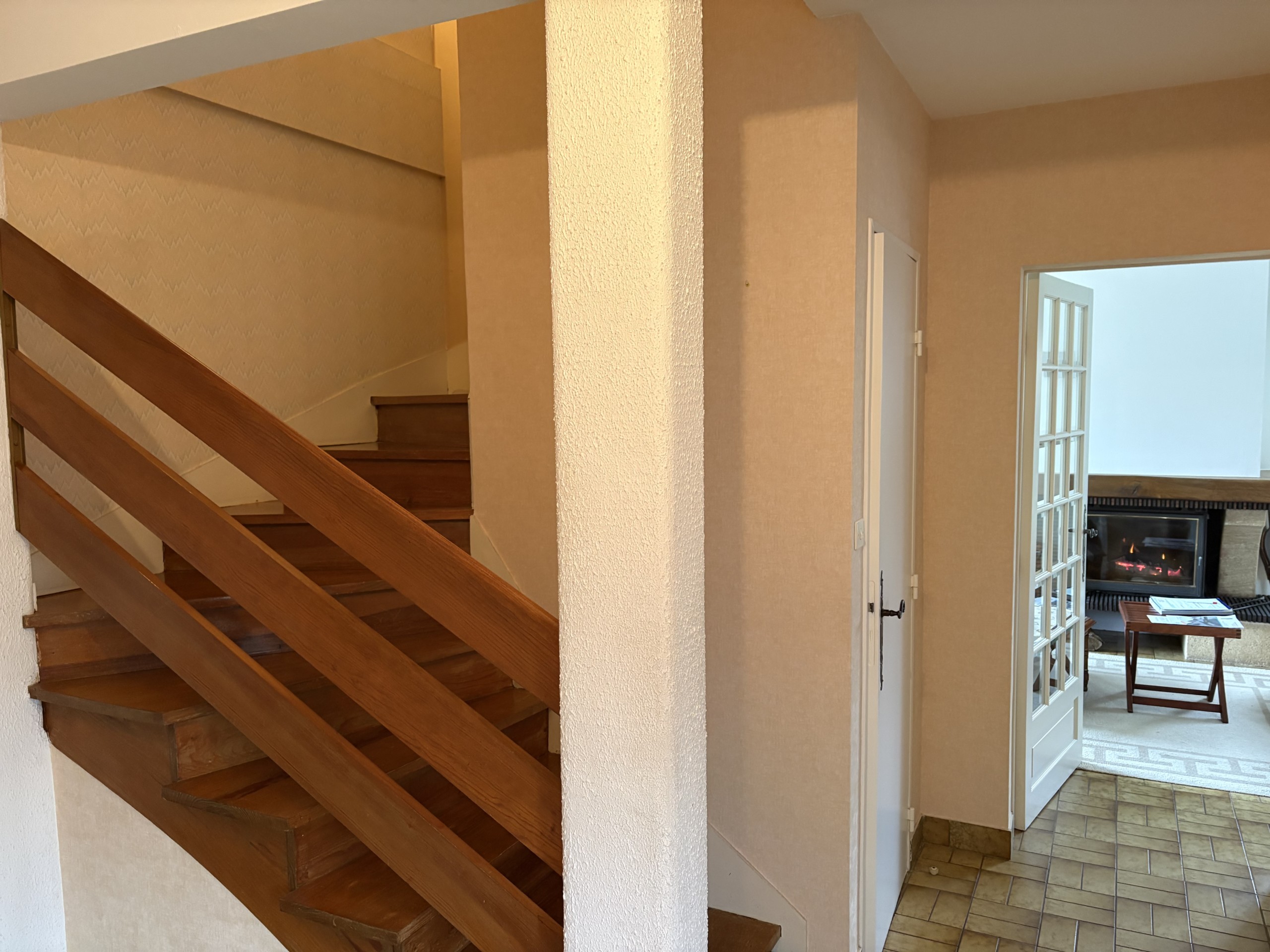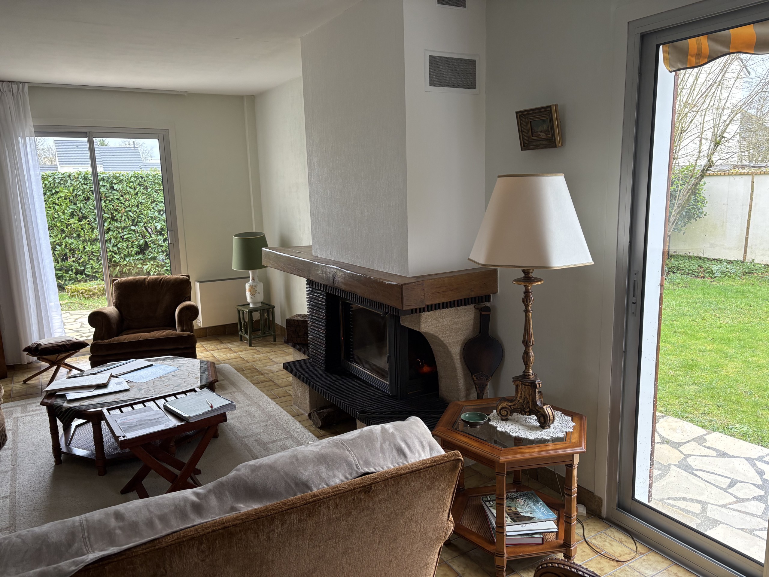 Elle comprend une entrée avec placard, beau salon et salle à manger d’environ 35 m² avec insert fonctionnel, lumière passante donnant à la pièce beaucoup de luminosité, carrelage au sol, cuisine aménagée et équipée avec coin repas donnant sur le jardin, WC séparés.