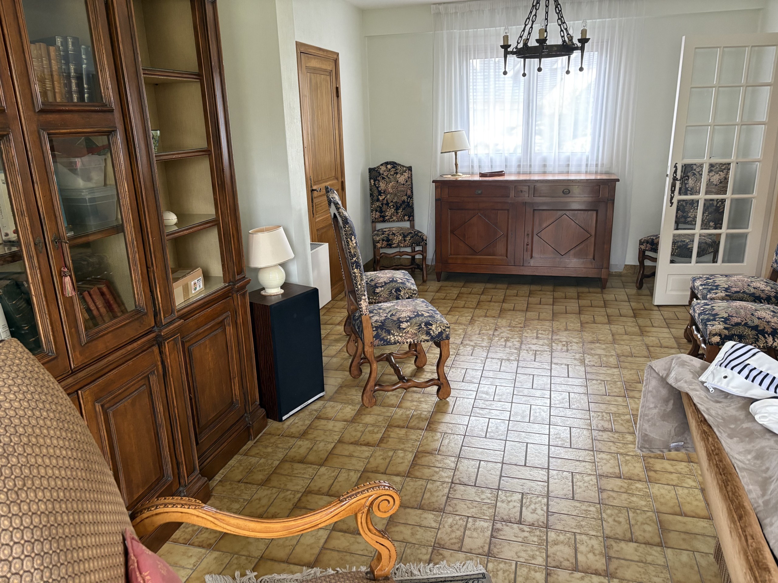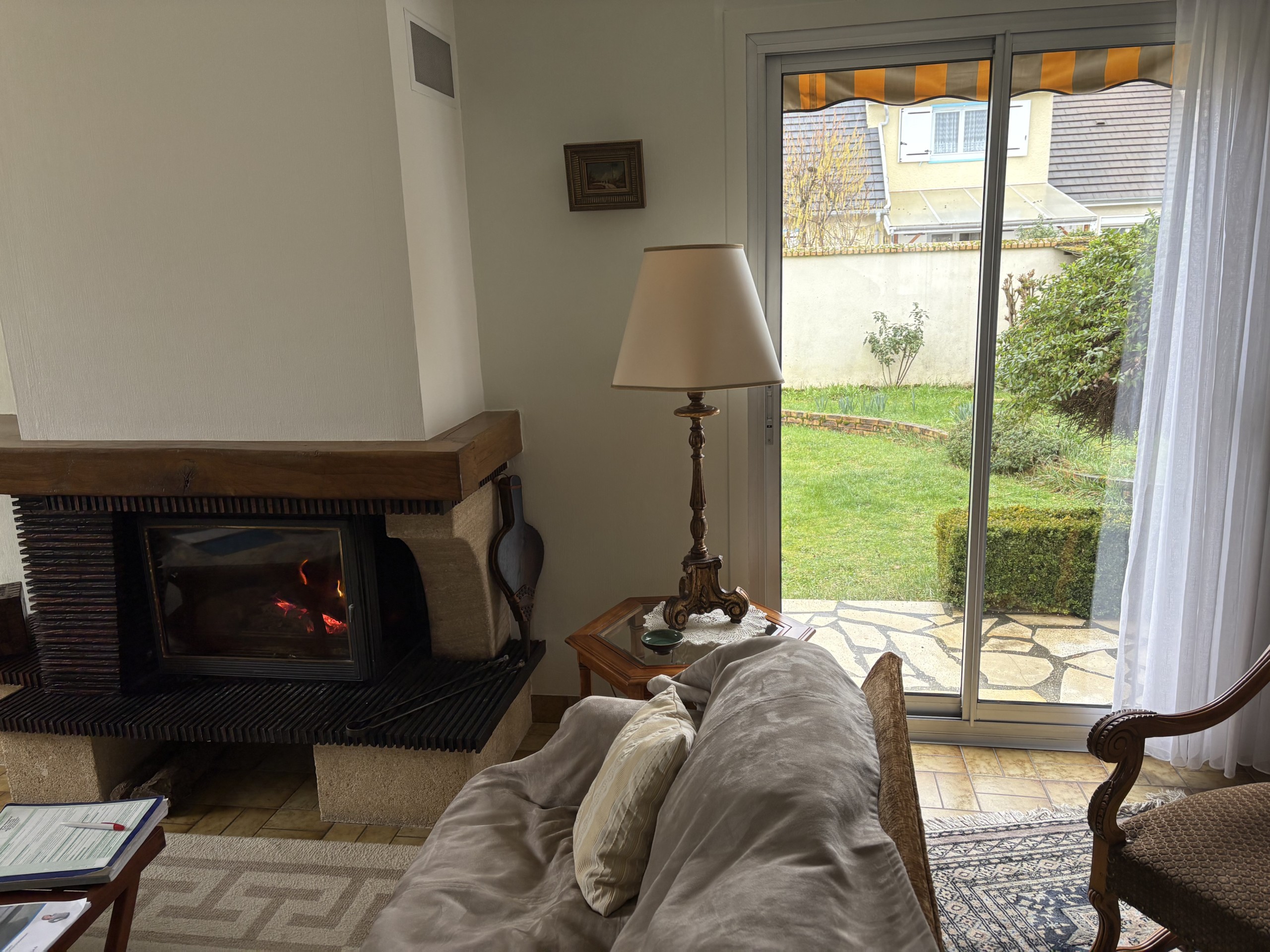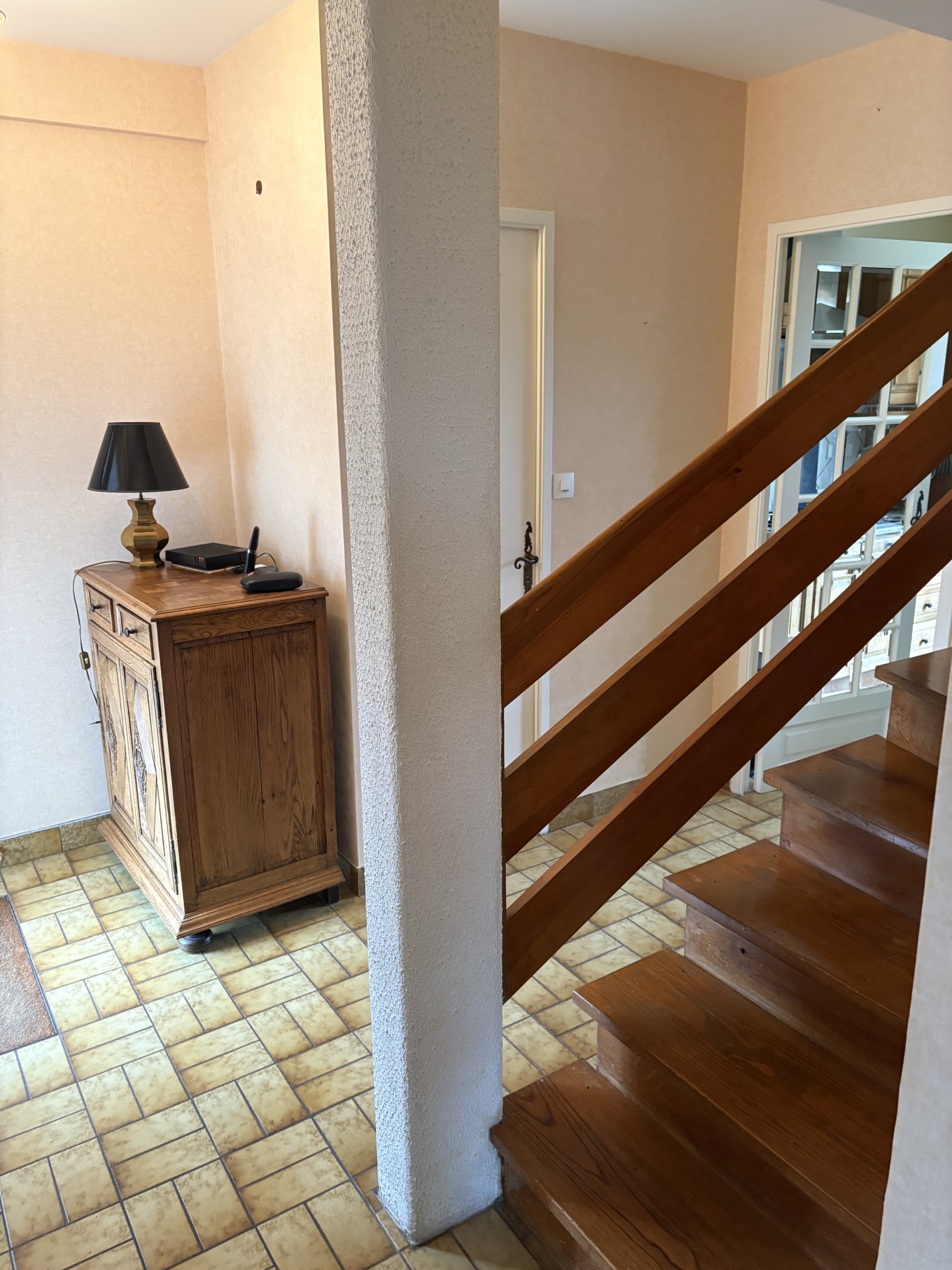 Elle comprend une entrée avec placard, beau salon et salle à manger d’environ 35 m² avec insert fonctionnel, lumière passante donnant à la pièce beaucoup de luminosité, carrelage au sol, cuisine aménagée et équipée avec coin repas donnant sur le jardin, WC séparés.