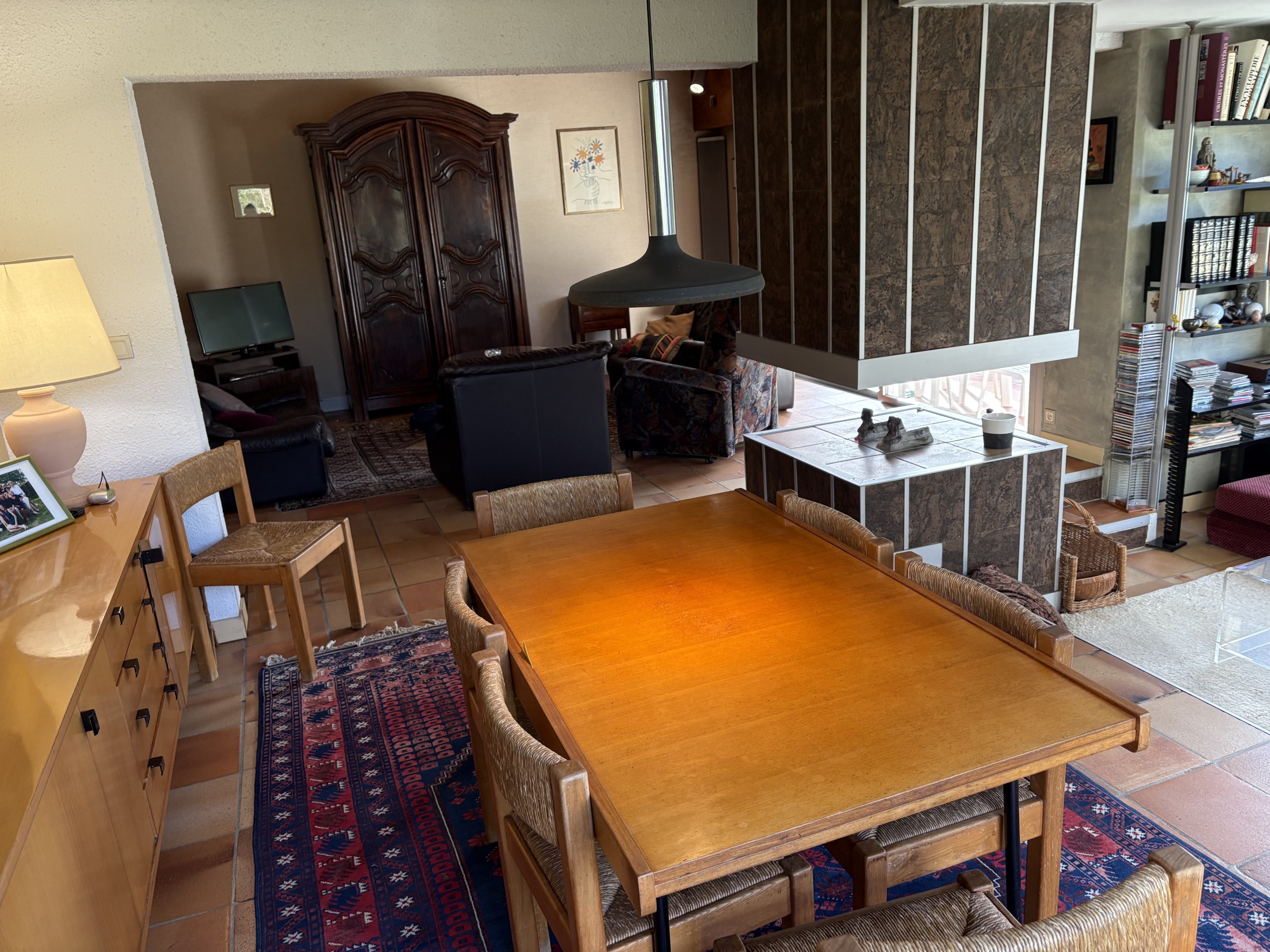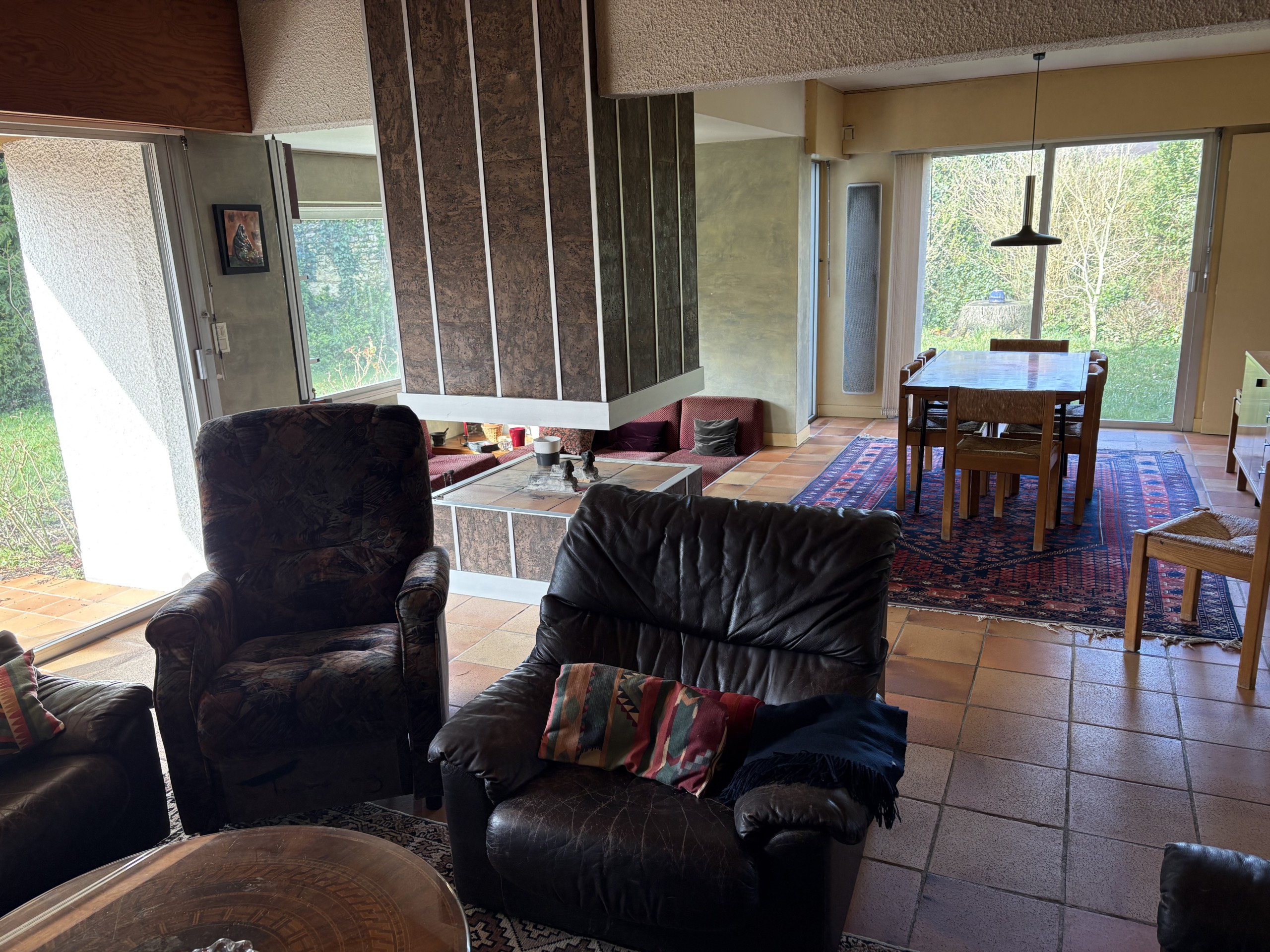 Au rez de chaussée : belle entrée avec vestiaire, grand open space de 43 m² composé d’un salon spacieux d’une salle à manger et d’un petit salon cocooning en contrebas, une cheminée centrale, le tout entouré de baies vitrées. Grande cuisine séparée, aménagée et équipée, WC.