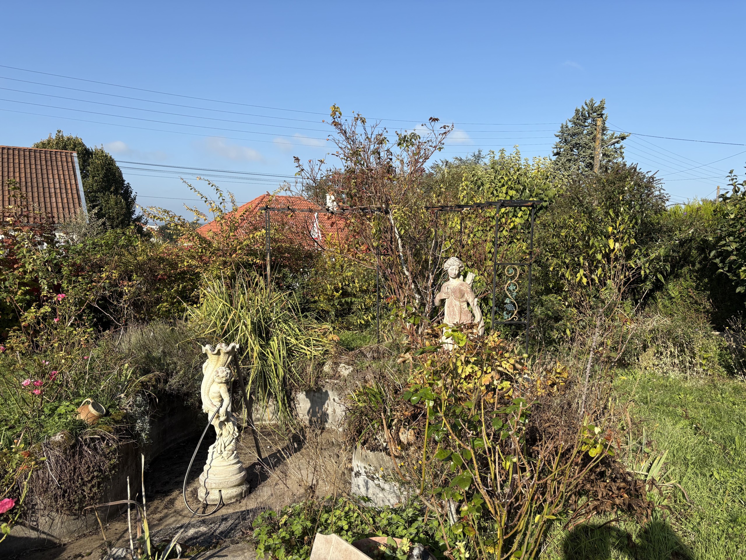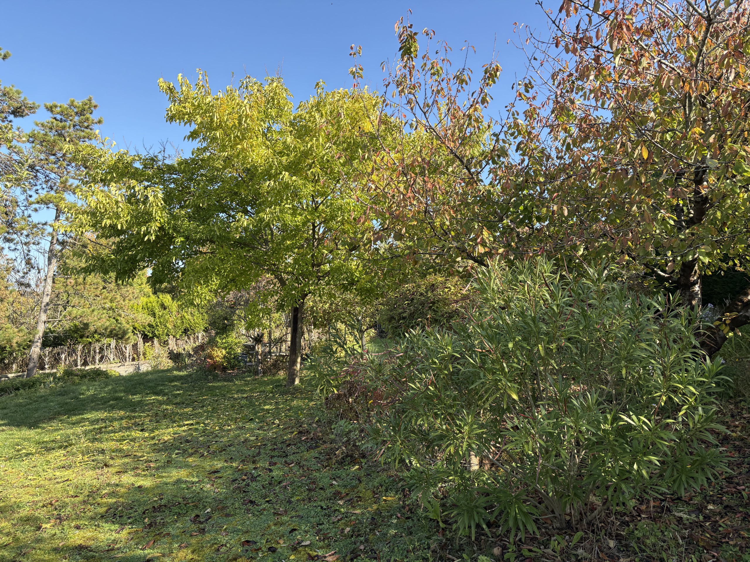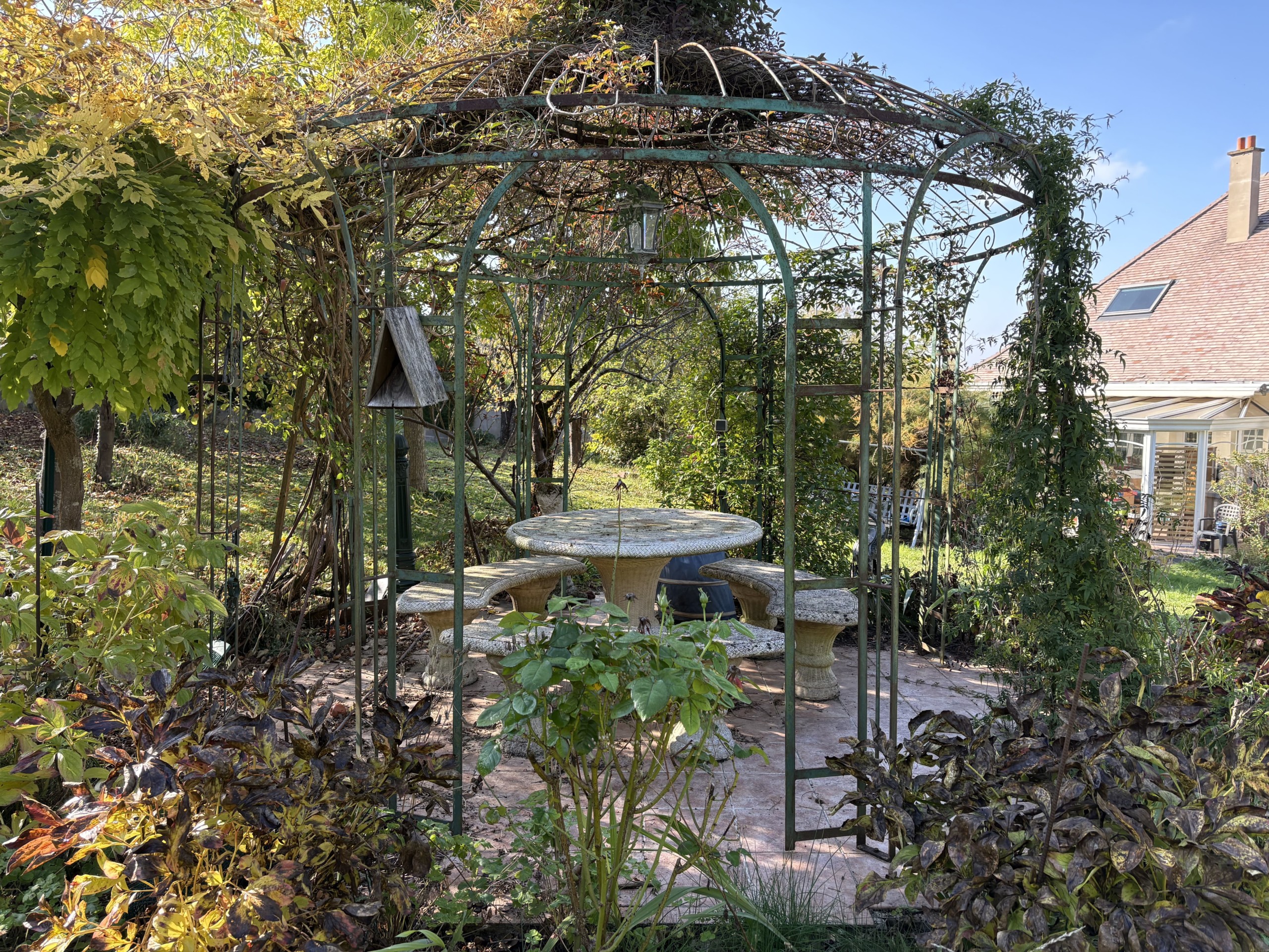 Très grand jardin dont une partie légèrement en pente avec une gloriette aménagée (prises électriques) très élégante. Petit bassin avec fontaine à l’avant, nombreuses espèces végétales donnant à l’ensemble un environnement très attrayant indépendamment de la vue.