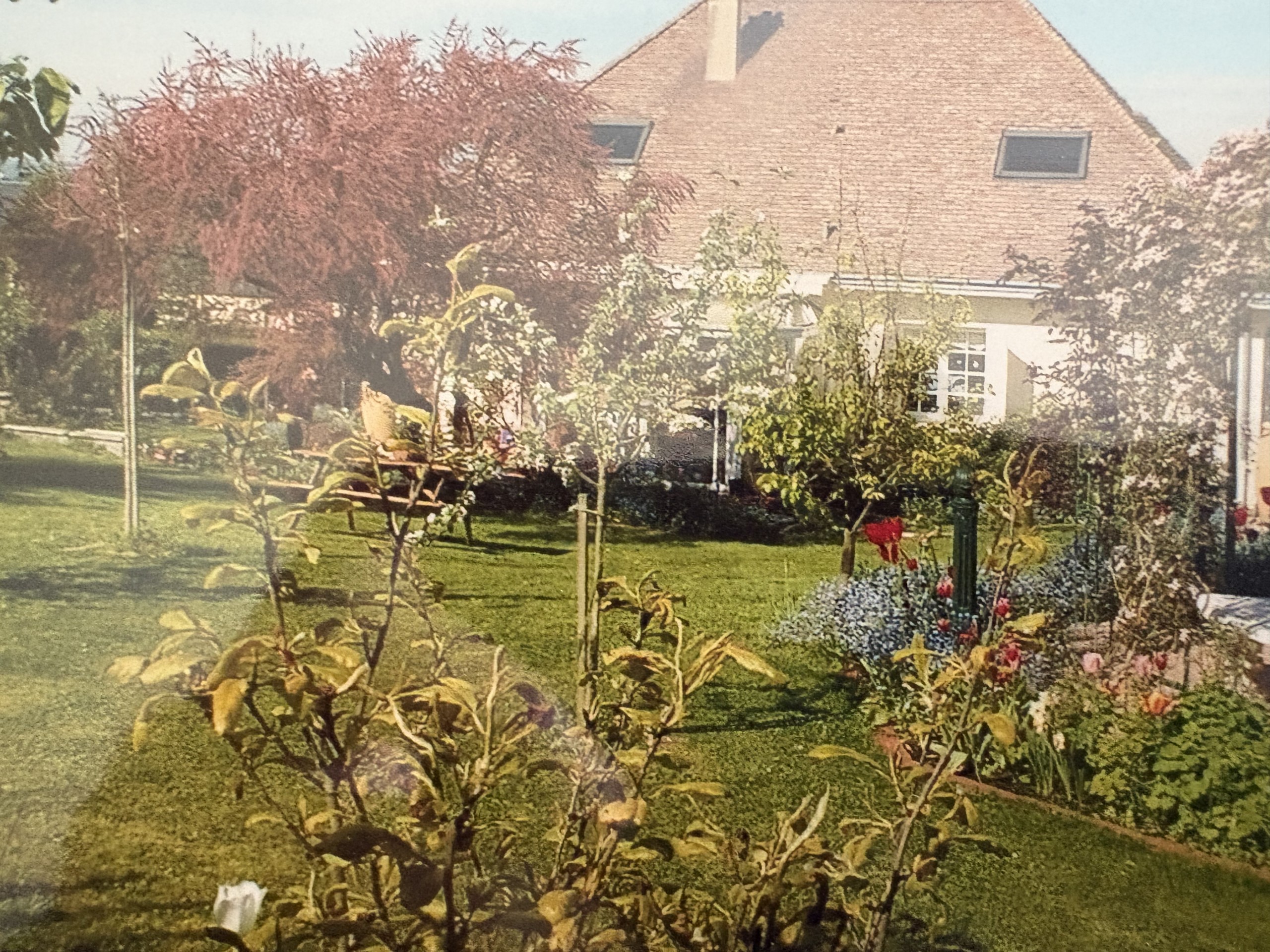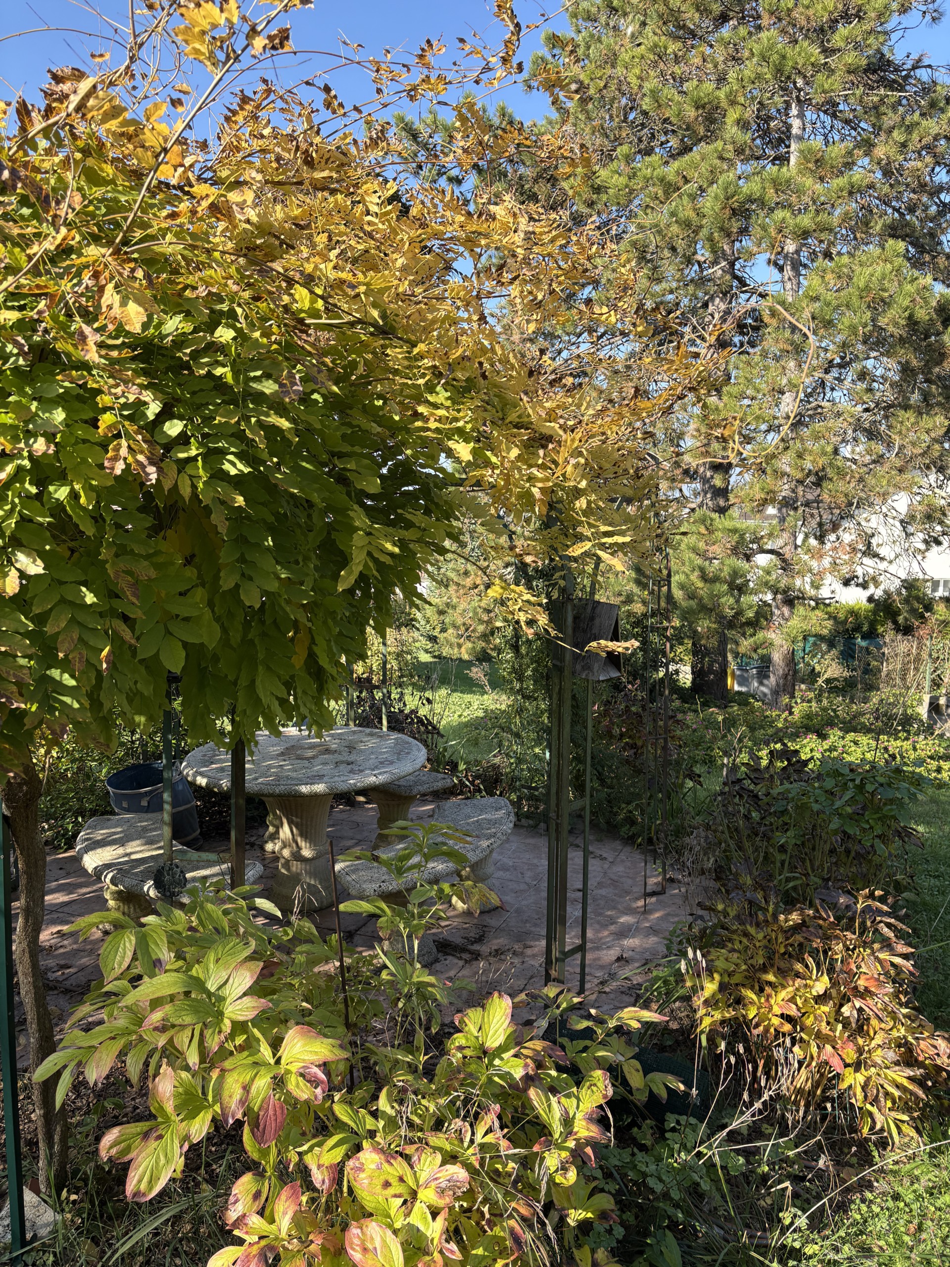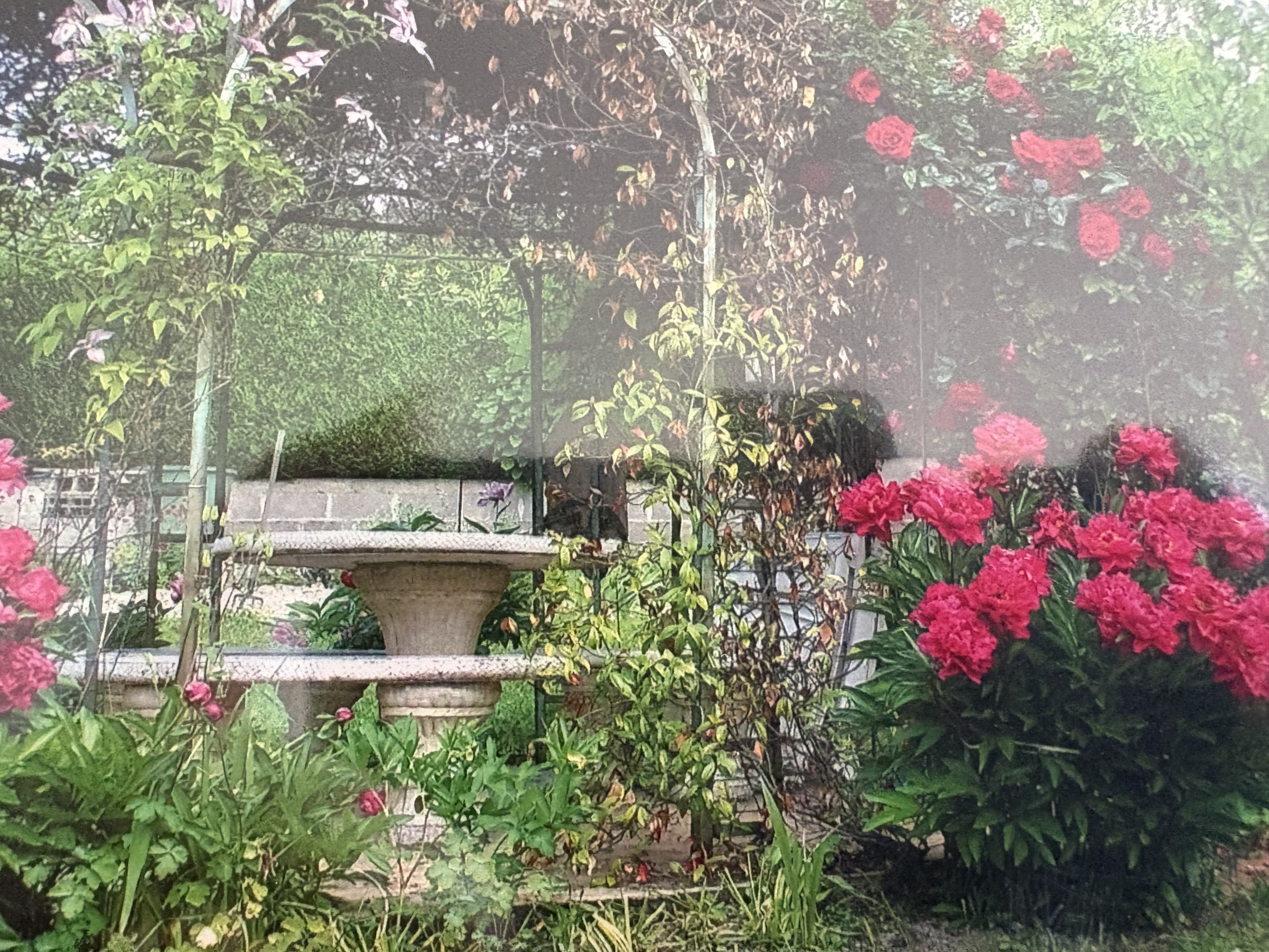 Très grand jardin dont une partie légèrement en pente avec une gloriette aménagée (prises électriques) très élégante. Petit bassin avec fontaine à l’avant, nombreuses espèces végétales donnant à l’ensemble un environnement très attrayant indépendamment de la vue.