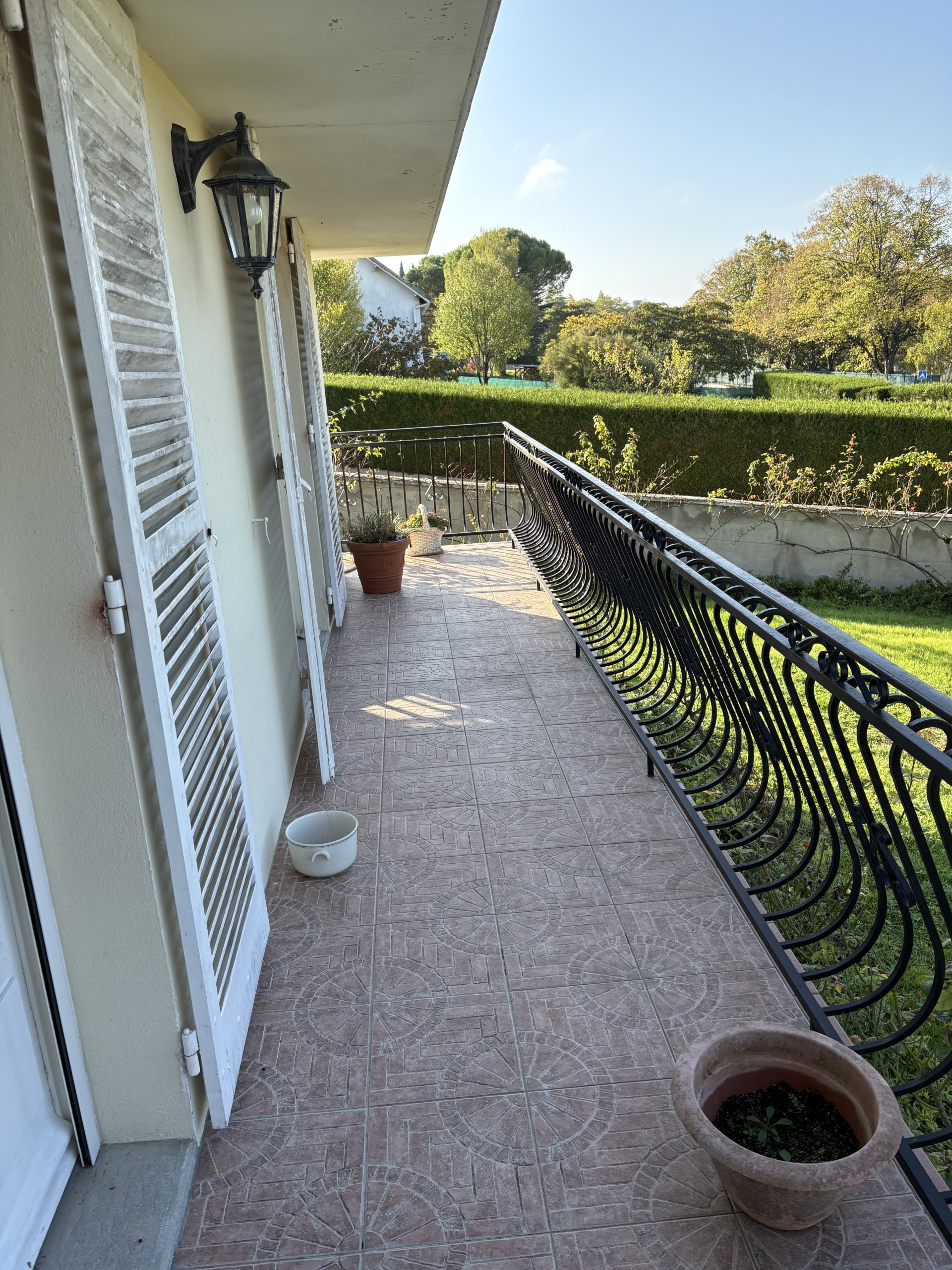 A l’arrière de la maison au même niveau : très grande véranda avec accès direct sur le jardin verdoyant.