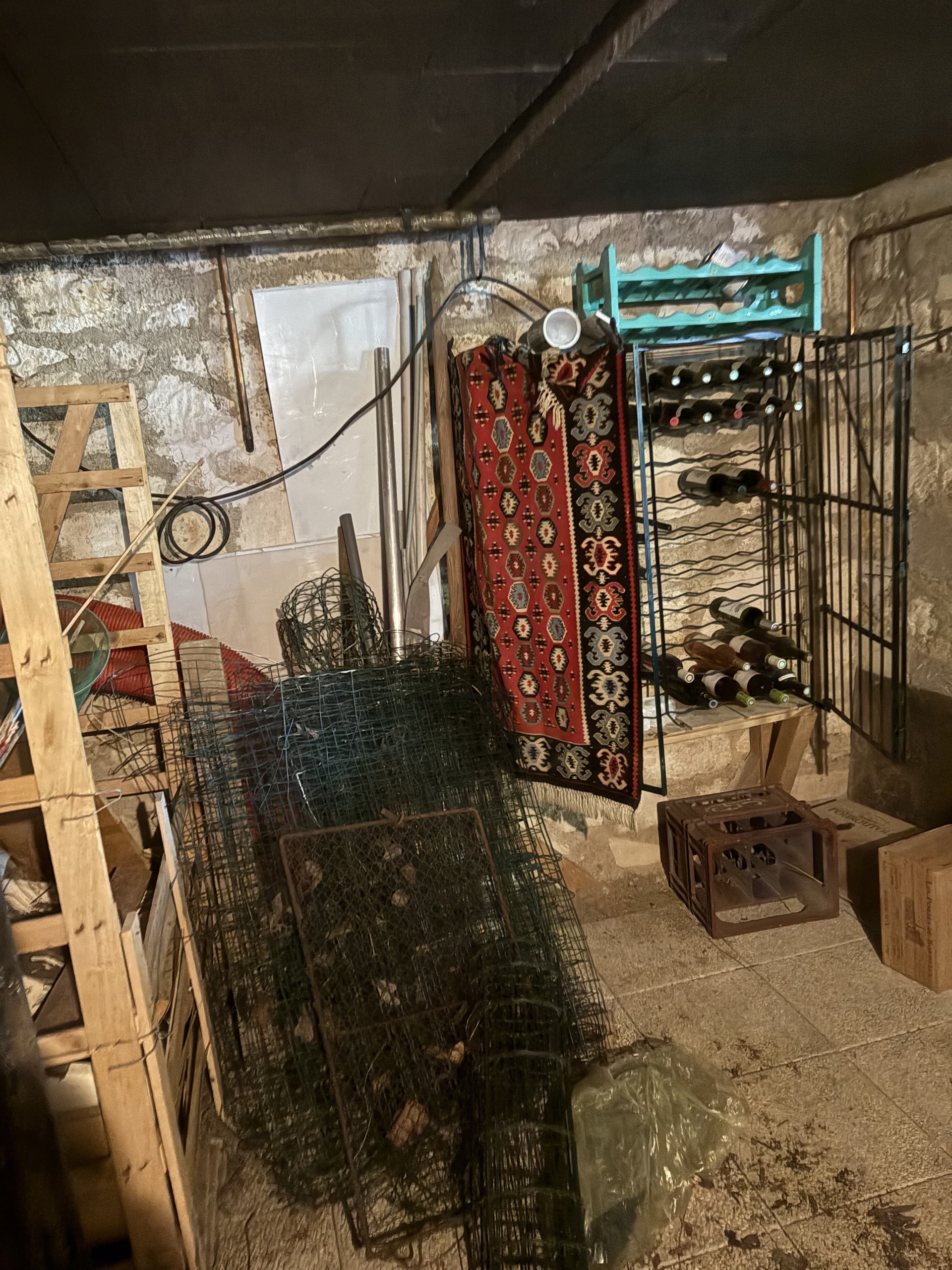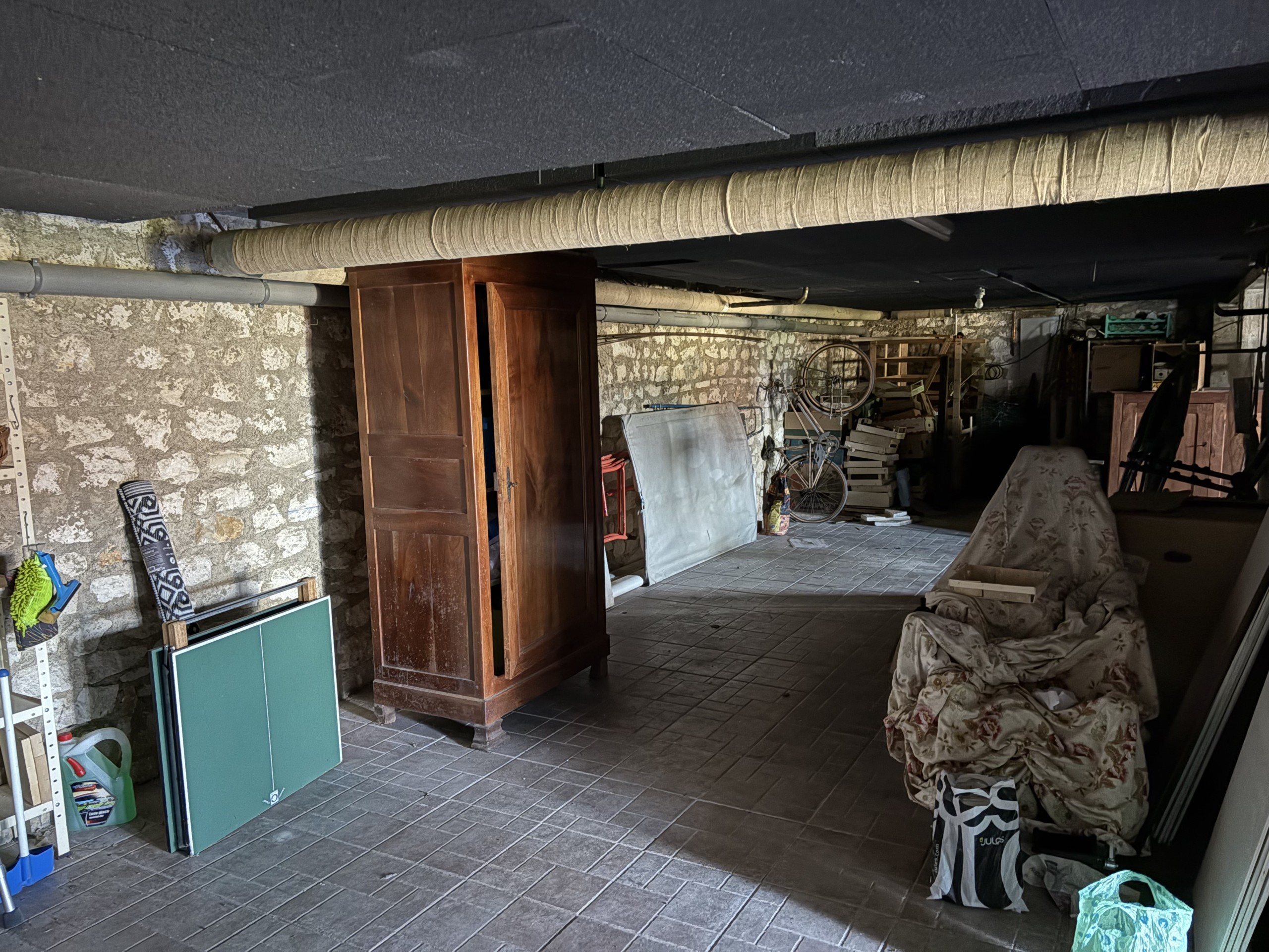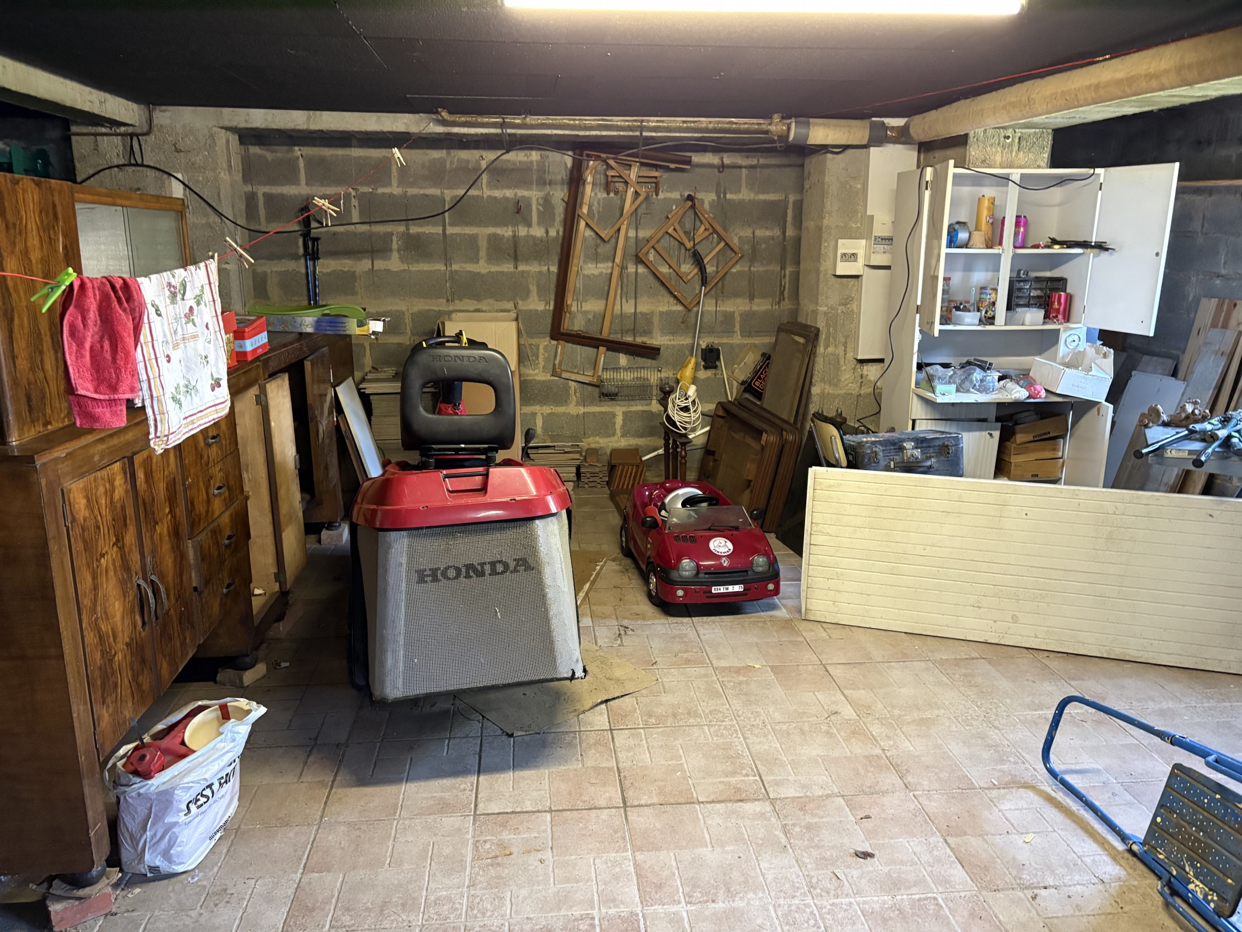 Grand sous-sol carrelé avec porte électrique, sous sol d’environ 150 m² avec coin cave, espace rangements, grand garage, fenêtres.